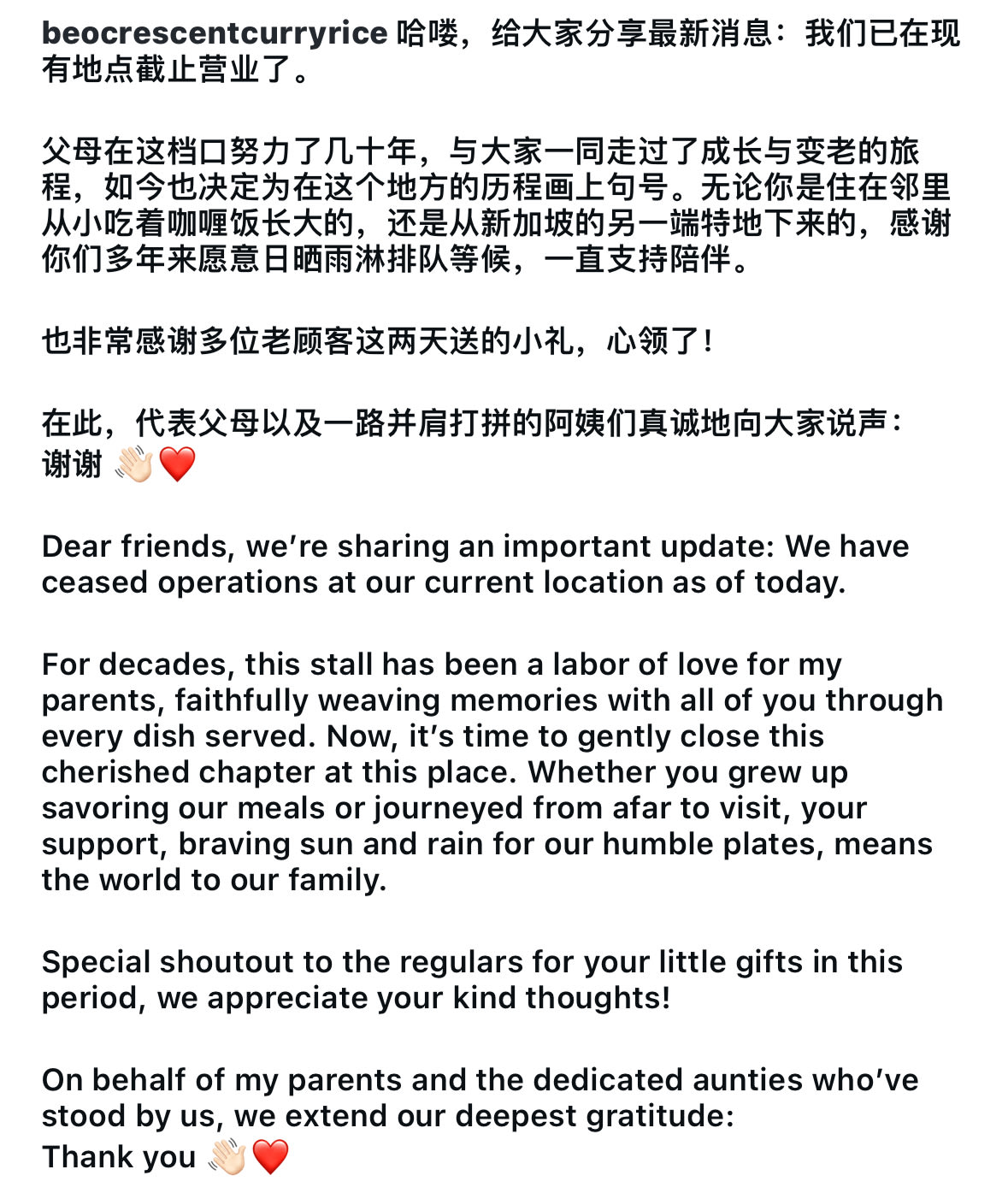 An update on September 30 from the hawkers’ children on the stall’s Instagram account announced the stall’s closure: “We have ceased operations at our current location as of today. For decades, this stall has been a labour of love for my parents, faithfully weaving memories with all of you through every dish served. Now, it’s time to gently close this cherished chapter at this place.”