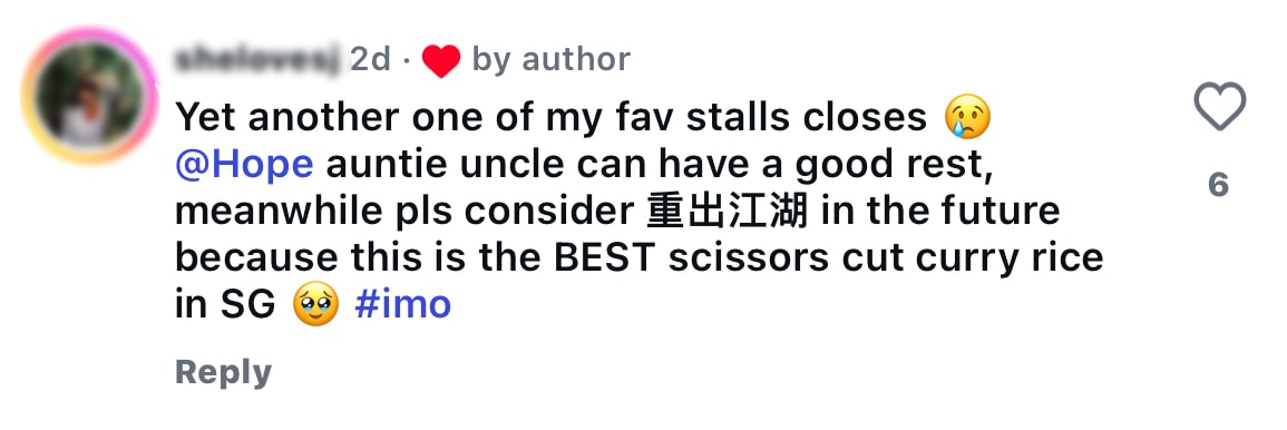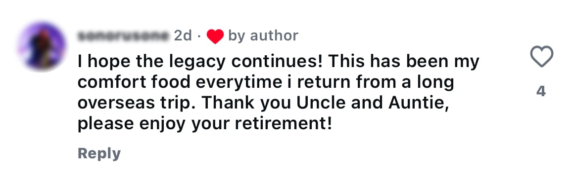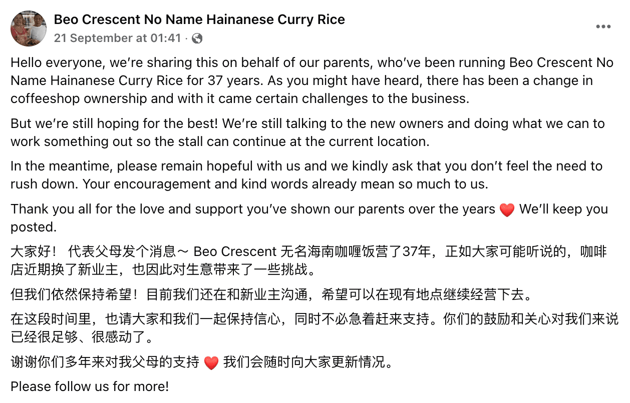 On 21 September, the hawkers’ children addressed the speculation in a Facebook post. Although they did not confirm the eatery’s closure at the time, they stated that talks with the new coffee shop owners were still in progress and they had hopes of reaching an agreement that would allow the stall to continue operating at the same location.