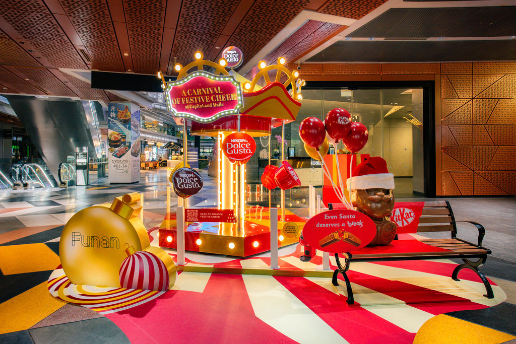 Over at Aperia Mall, Bugis Junction, CQ @ Clarke Quay, Funan, and Kallang Wave Mall, there will be a Nescafé Dolce Gusto and KitKat display featuring a huge rotating carousel stacked with colourful Nescafé Dolce Gusto capsules and a bright Christmas tree.
