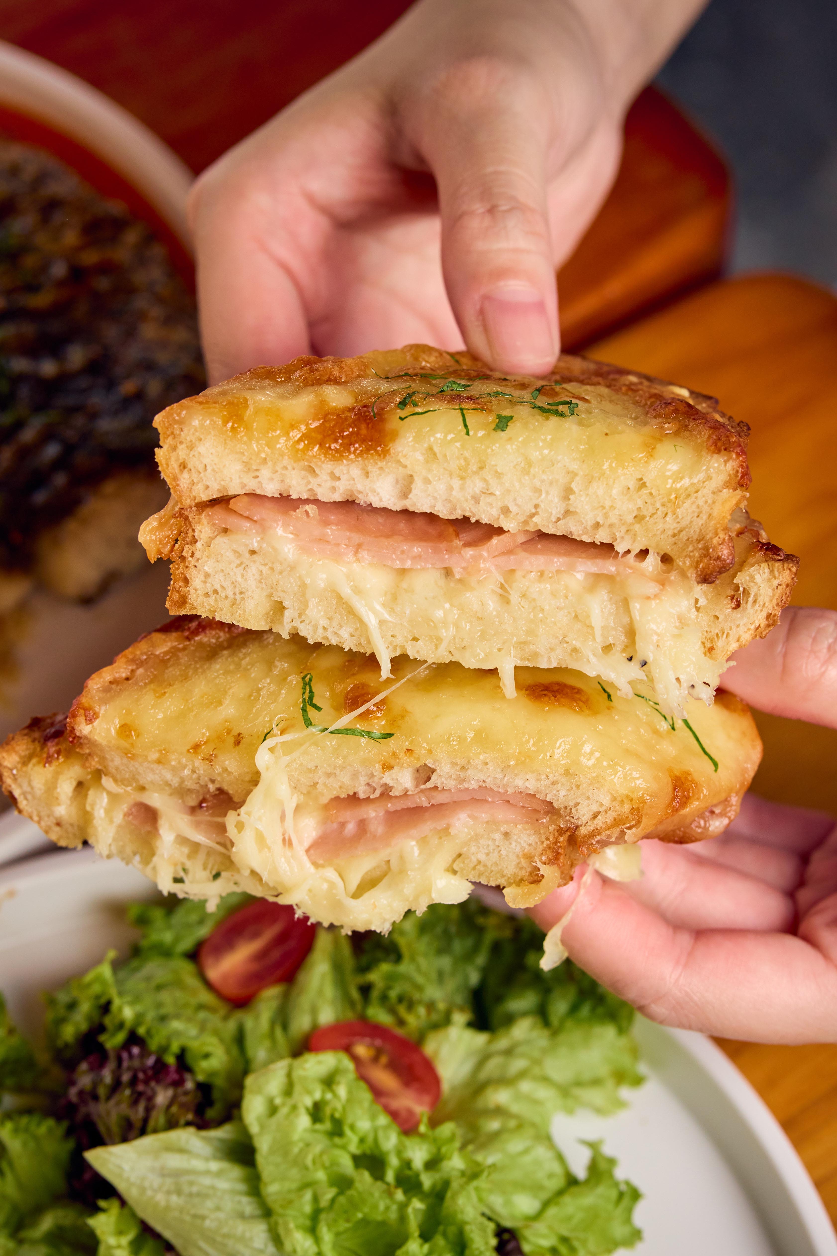 Chicken ham, emmental cheese and cheesy mornay sauce (a béchamel-style sauce) is tucked between polka bread and grilled to a crispy finish with more cheese. Very satisfying, and reasonably priced, considering you also get a healthy side of salad with this.