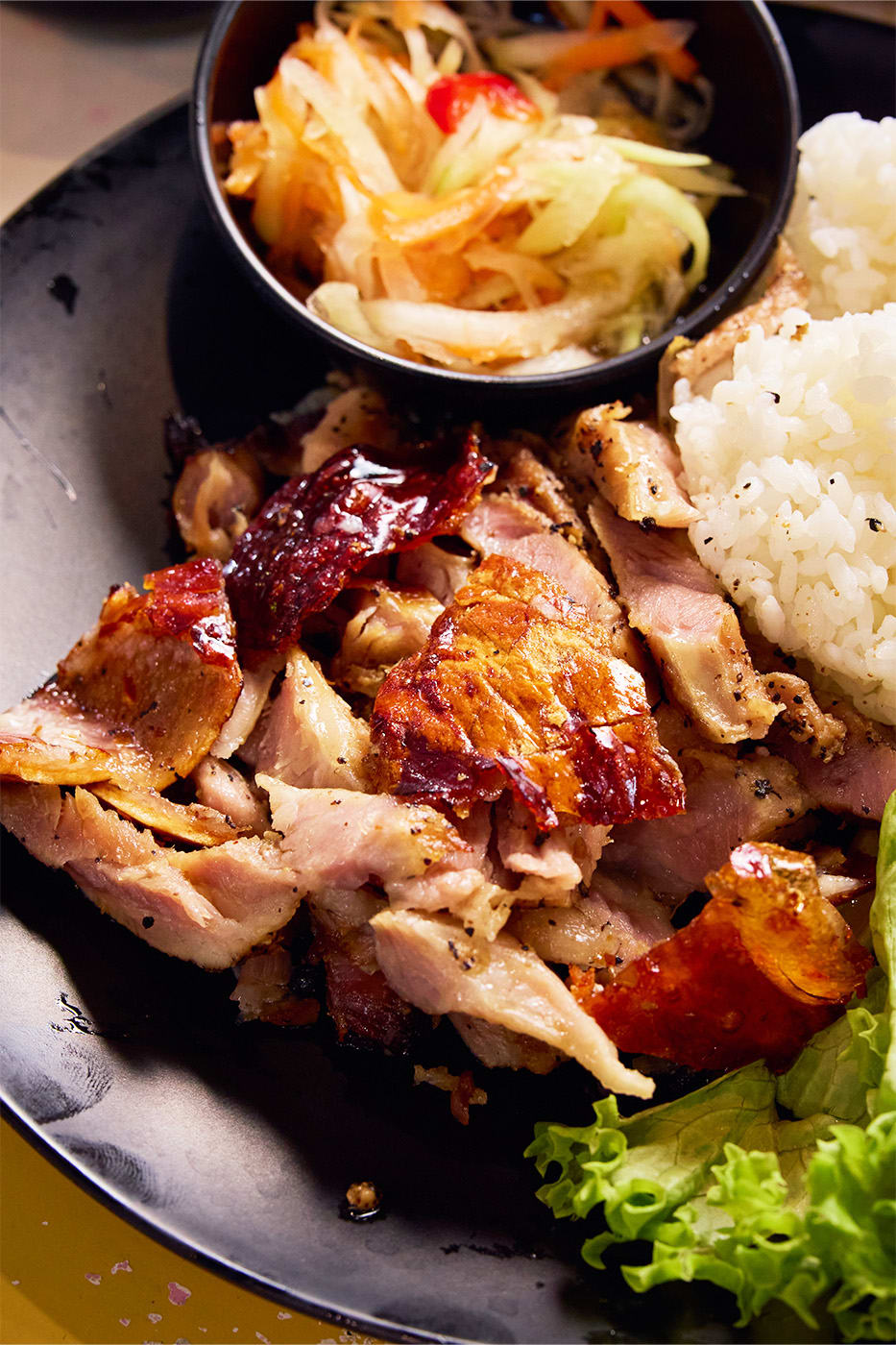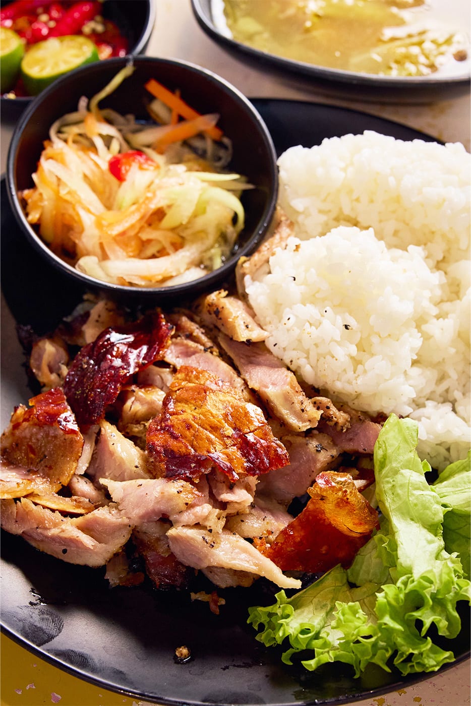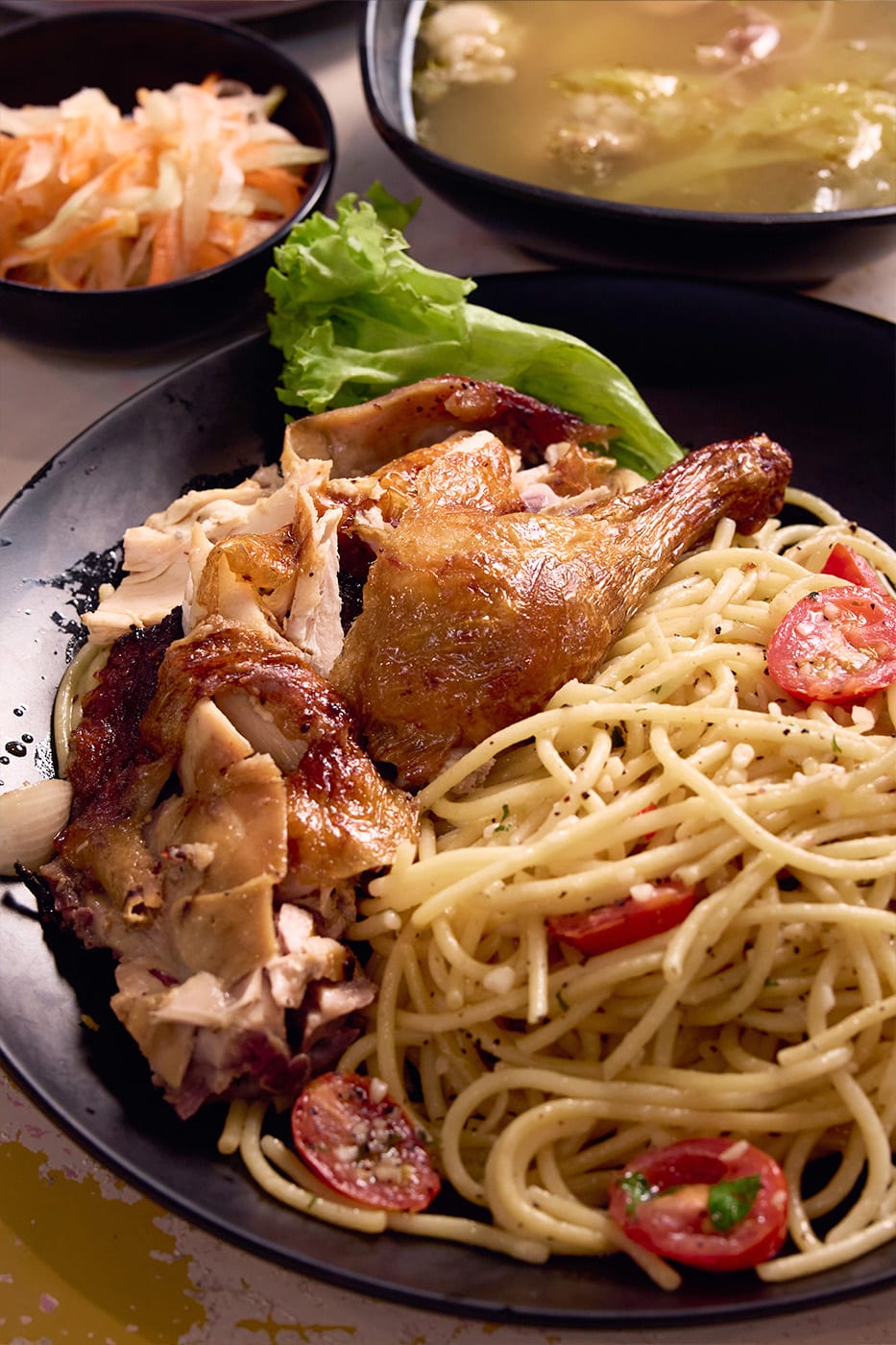 Each serving comes with a quarter of a spring chicken. Paired with a mound of al dente aglio olio, this makes for a hearty meal. The pasta is lightly garlicky, intentionally mild so as not to overpower the roast chicken’s delicate aromatics and smokiness. Also served with atchara and soup. A whole chicken (around 1.2kg) goes for $24.