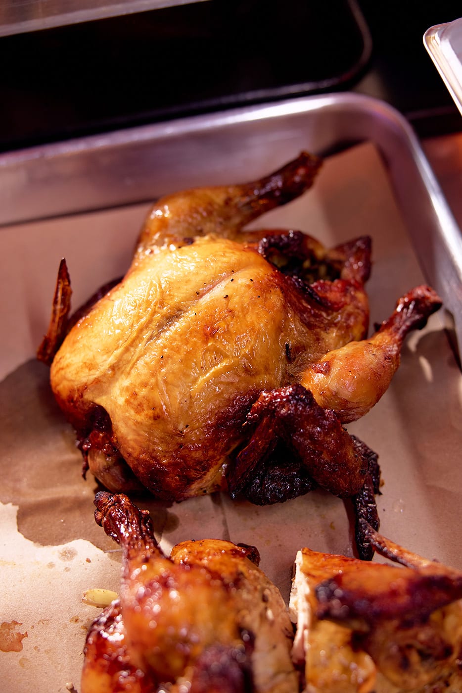 The chicken is roasted until the skin turns lightly crisp, encasing meat that stays moist and flavourful. The drippings collected during roasting are turned into a simple jus, which she drizzles over the chicken just before serving for extra savouriness.