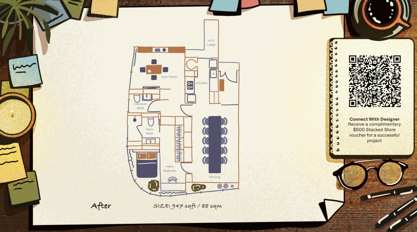 Design adjustments include an open kitchen with a long dining table, an expanded primary bedroom, and additional wardrobe space. A redesigned divider wall maximises storage without adding bulk, cleverly concealing the AC unit and sound system.