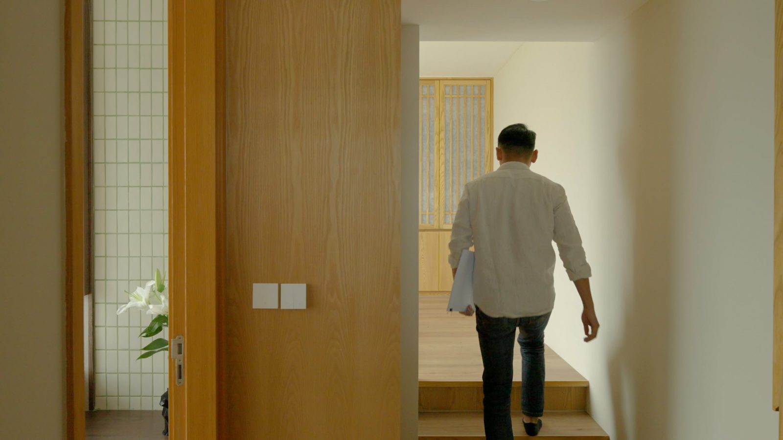 The interior combines classic Japanese elements-such as Washi paper, wood textures, and tatami-inspired details — with contemporary materials like stone slabs and metallic brass. This mix lends a modern yet serene feel to the home.