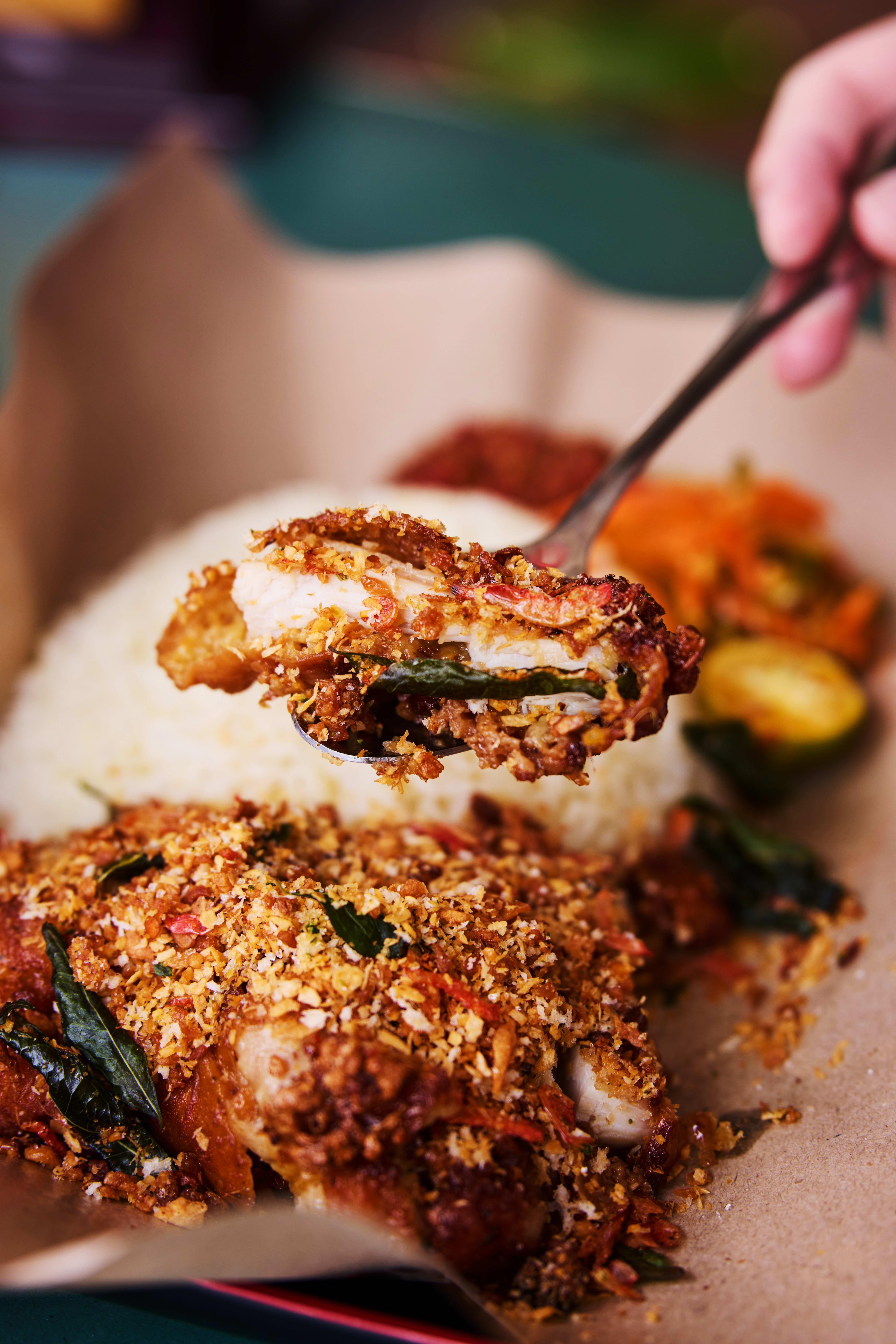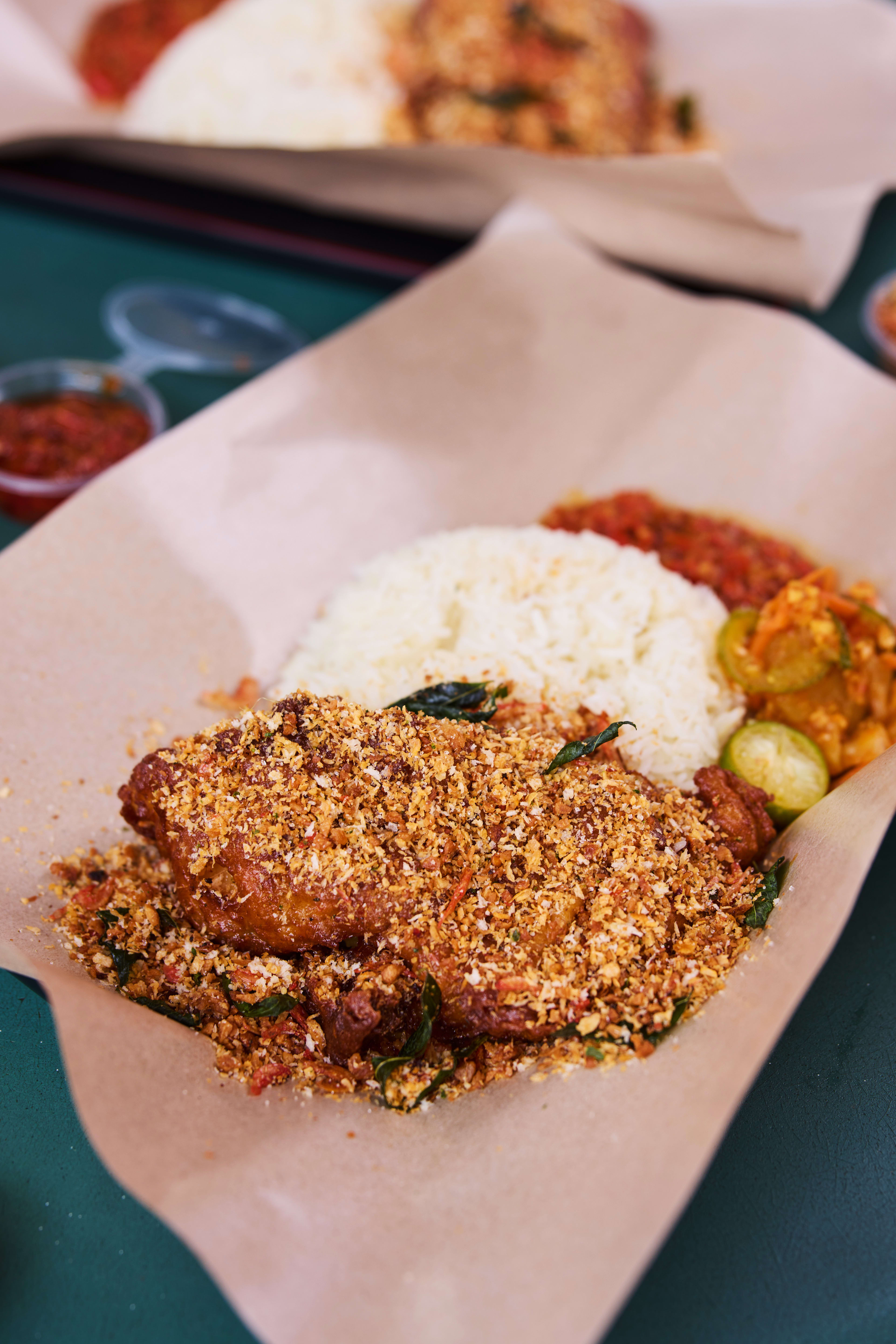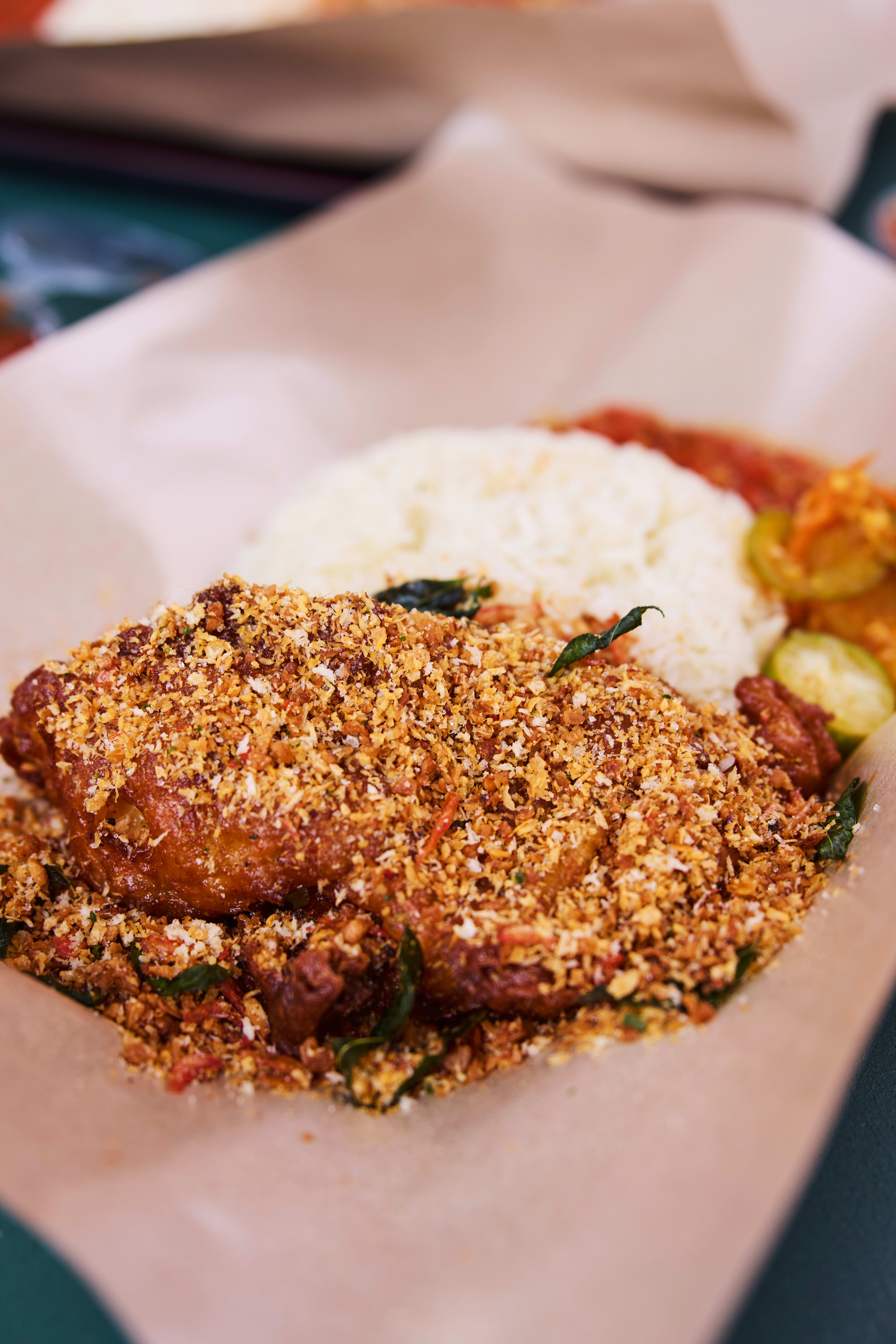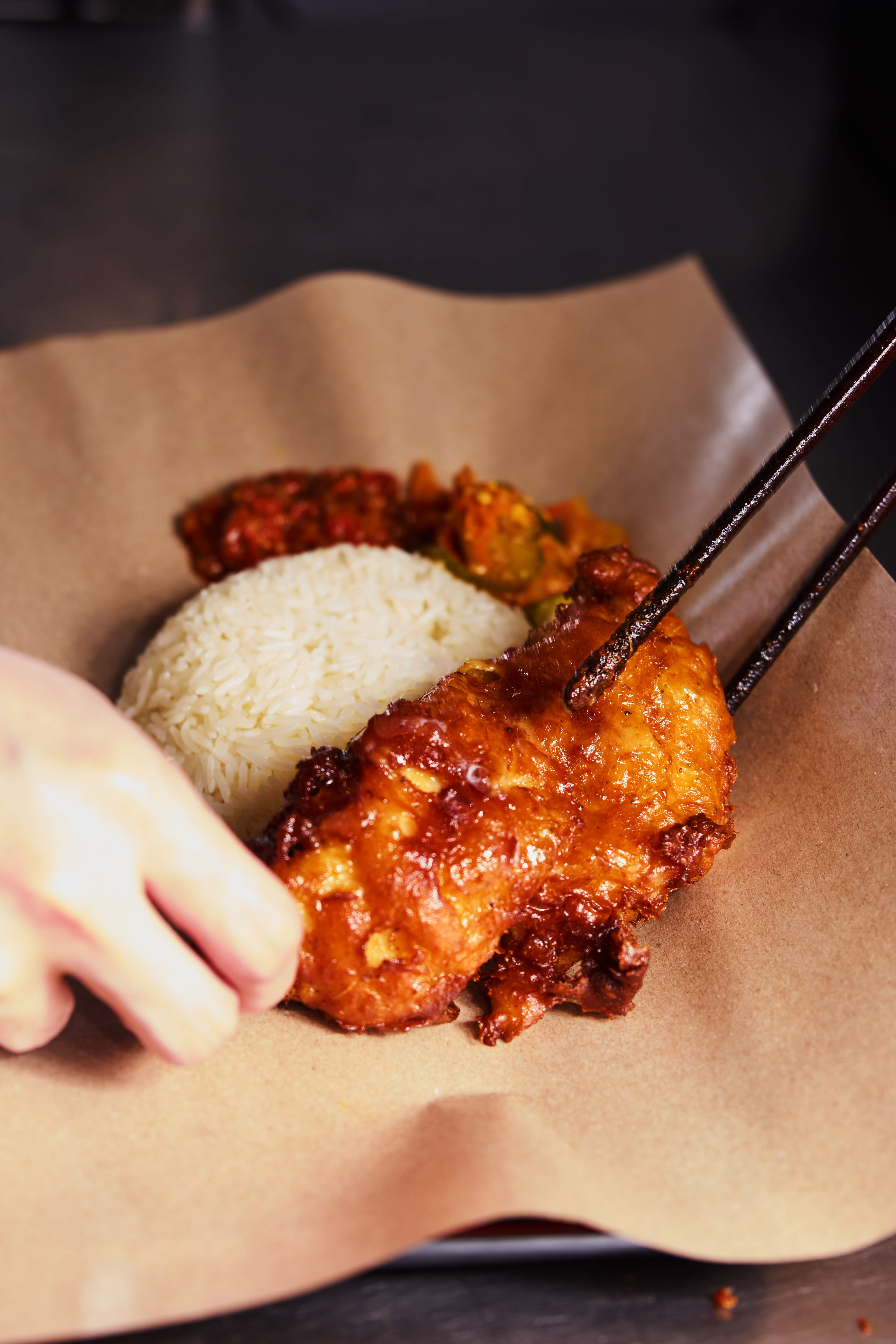 Berempah Bros was launched just weeks after Derek’s son was born. The concept is inspired by ayam goreng berempah, a Malaysian-style fried chicken built around a spice paste with aromatics such as lemongrass and turmeric. The ‘Bros’ approach sits somewhere between the Malaysian chook (where spices are worked into the meat like those you find in The Coconut Club’s nasi lemak) and Indonesian ayam goreng remah (where spiced battered crumbs are added on top). But there’s an added step at this stall — the meat and fish are dipped in seasoned batter before being deep-fried for a thicker, shaggier crust. Each dish is served with sinful coconut and chicken fat-infused rice.