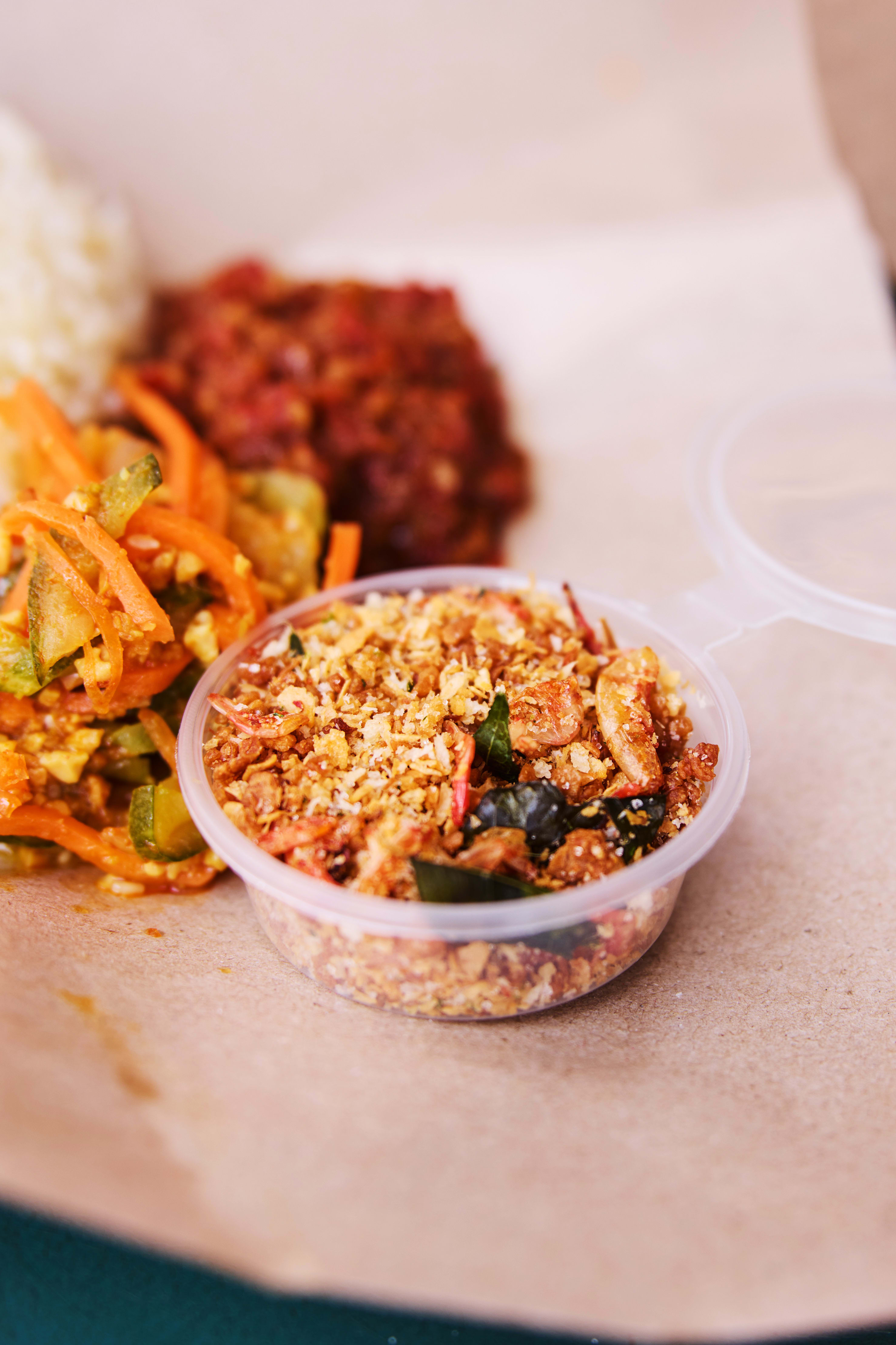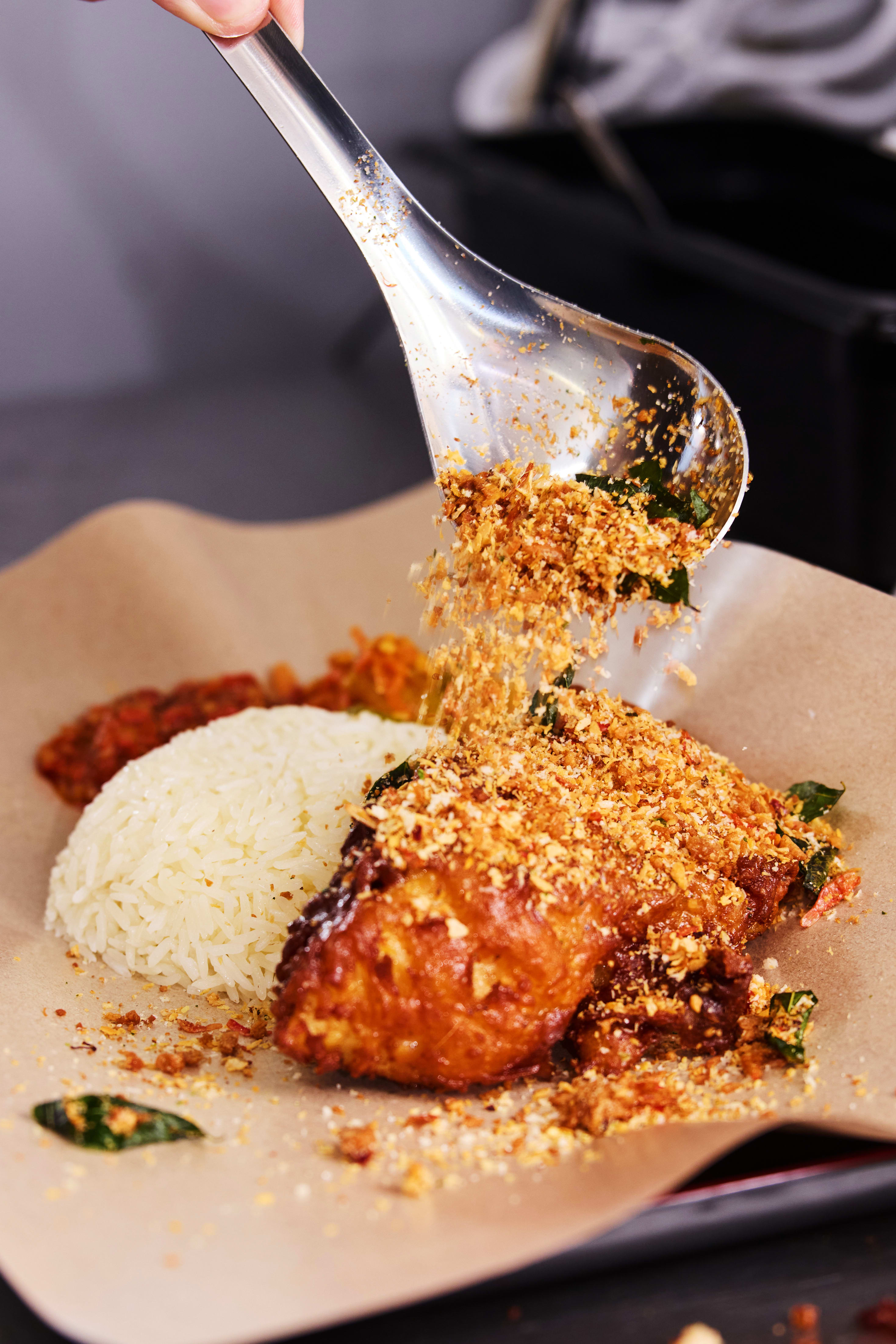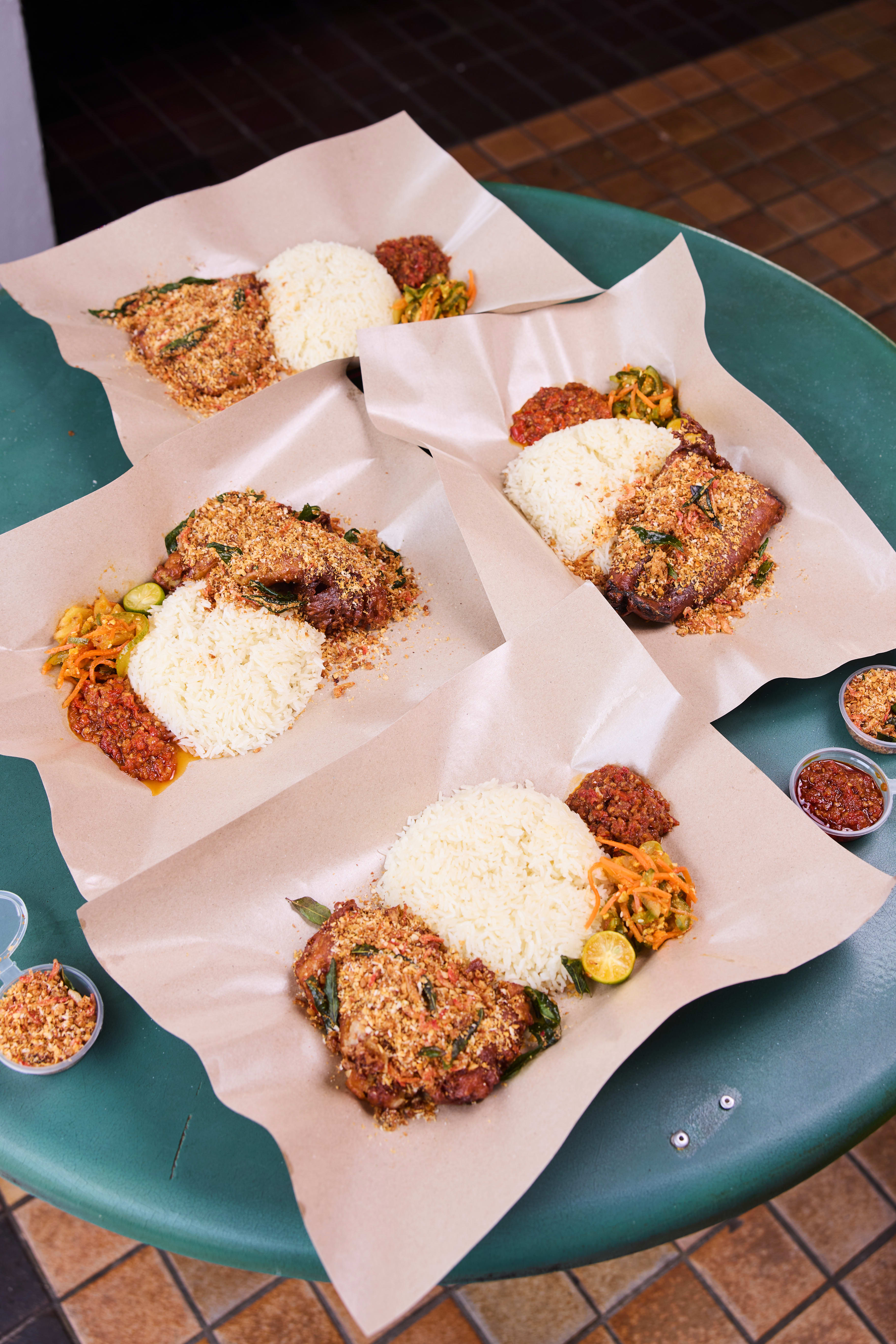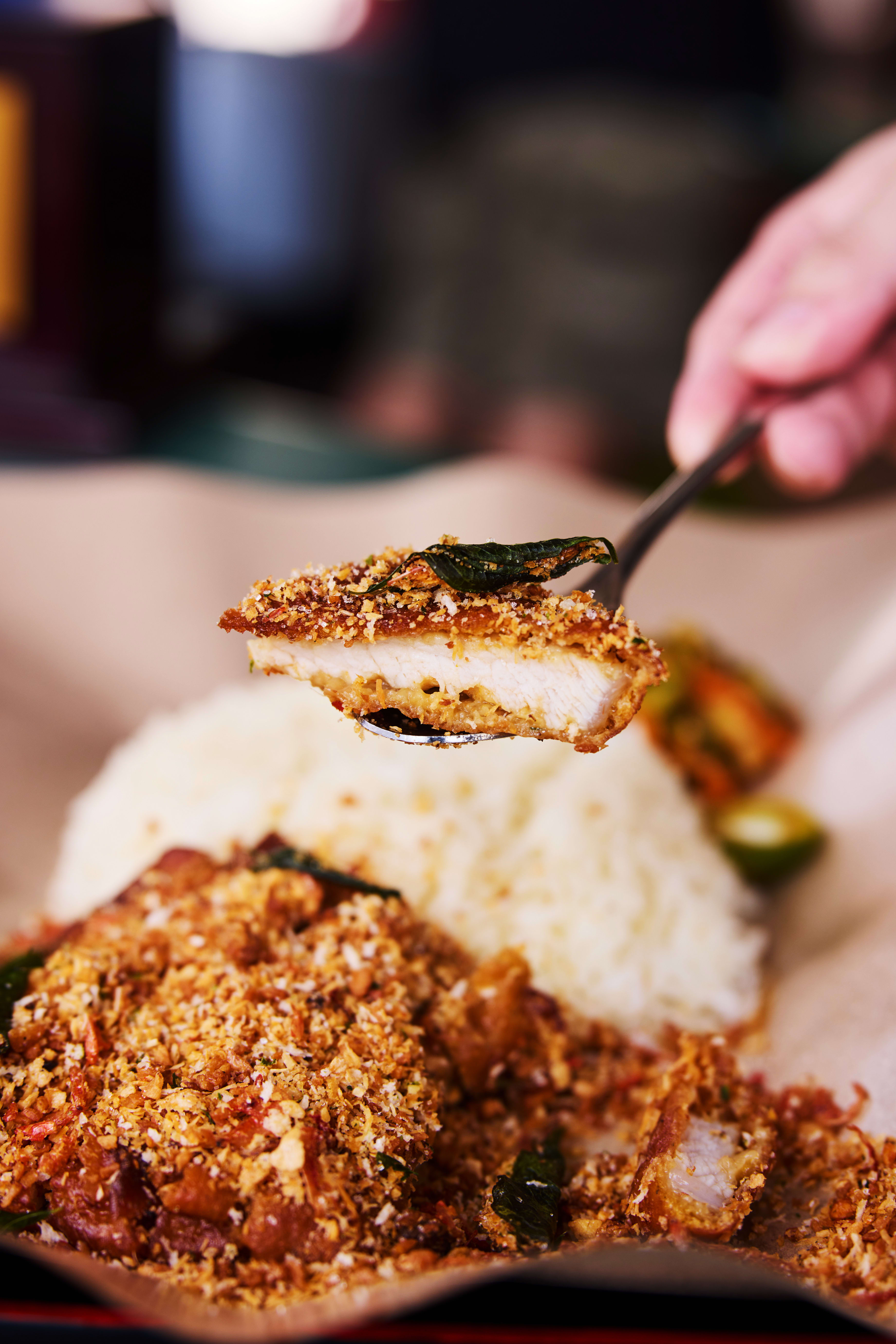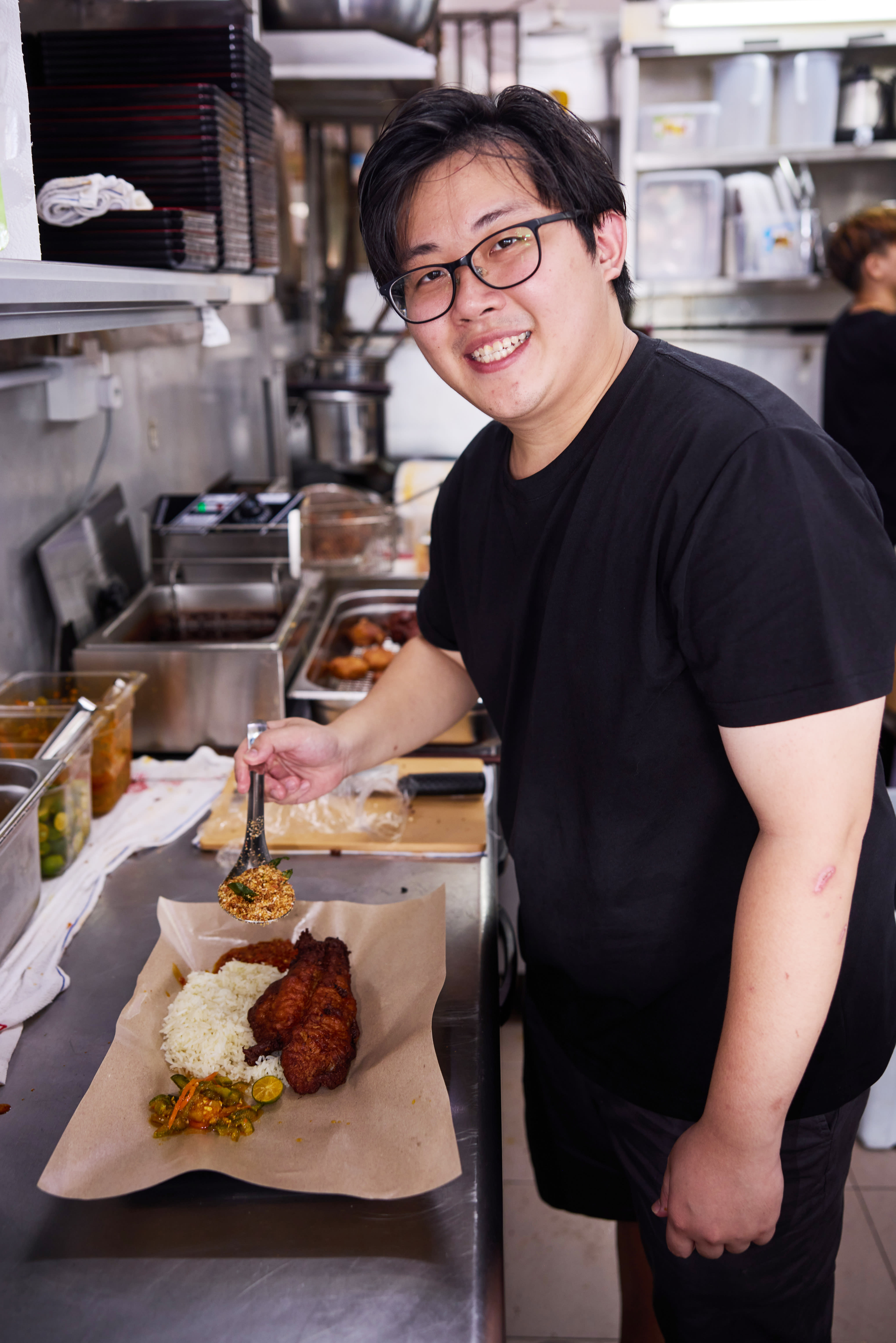 Berempah Bros was launched just weeks after Derek’s son was born. The concept is inspired by ayam goreng berempah, a Malaysian-style fried chicken built around a spice paste with aromatics such as lemongrass and turmeric. The ‘Bros’ approach sits somewhere between the Malaysian chook (where spices are worked into the meat like those you find in The Coconut Club’s nasi lemak) and Indonesian ayam goreng remah (where spiced battered crumbs are added on top). But there’s an added step at this stall — the meat and fish are dipped in seasoned batter before being deep-fried for a thicker, shaggier crust. Each dish is served with sinful coconut and chicken fat-infused rice.