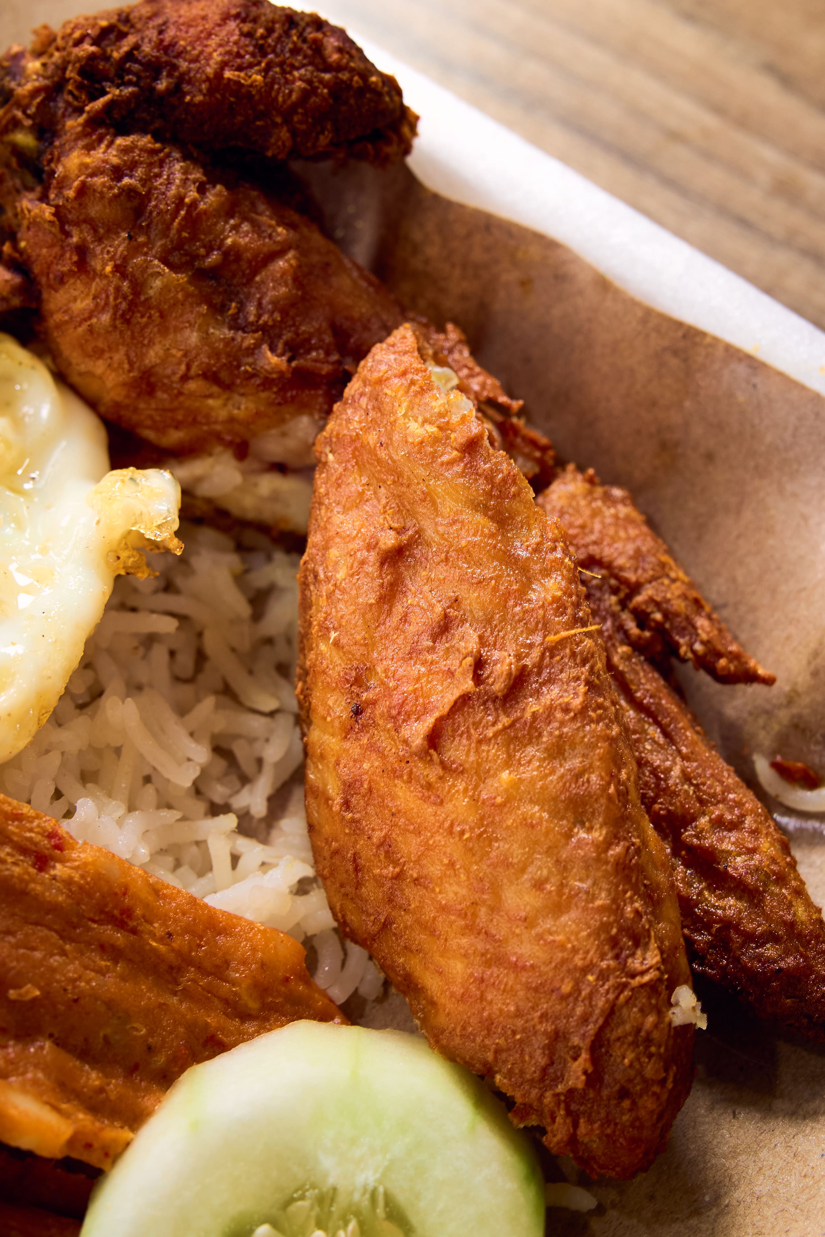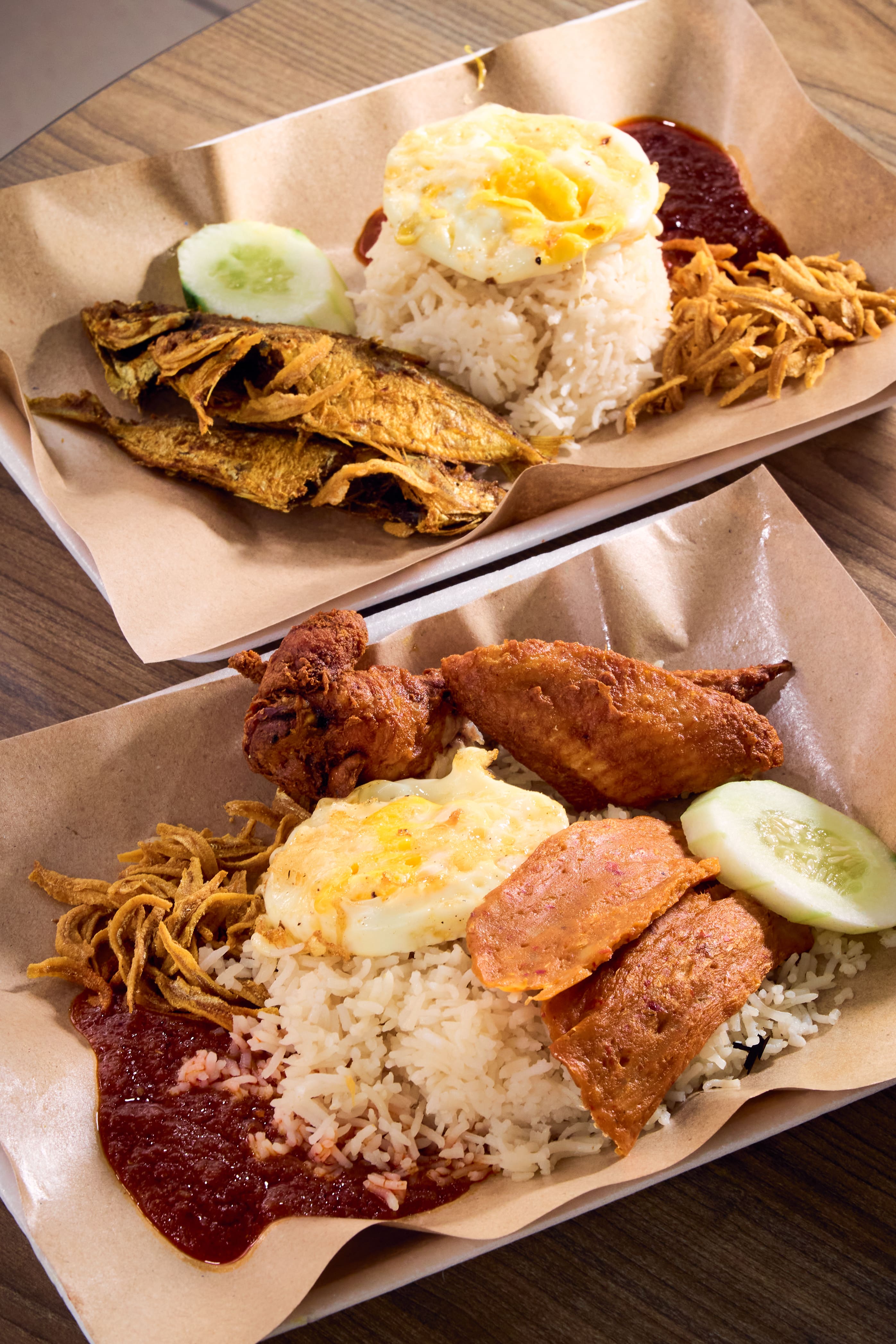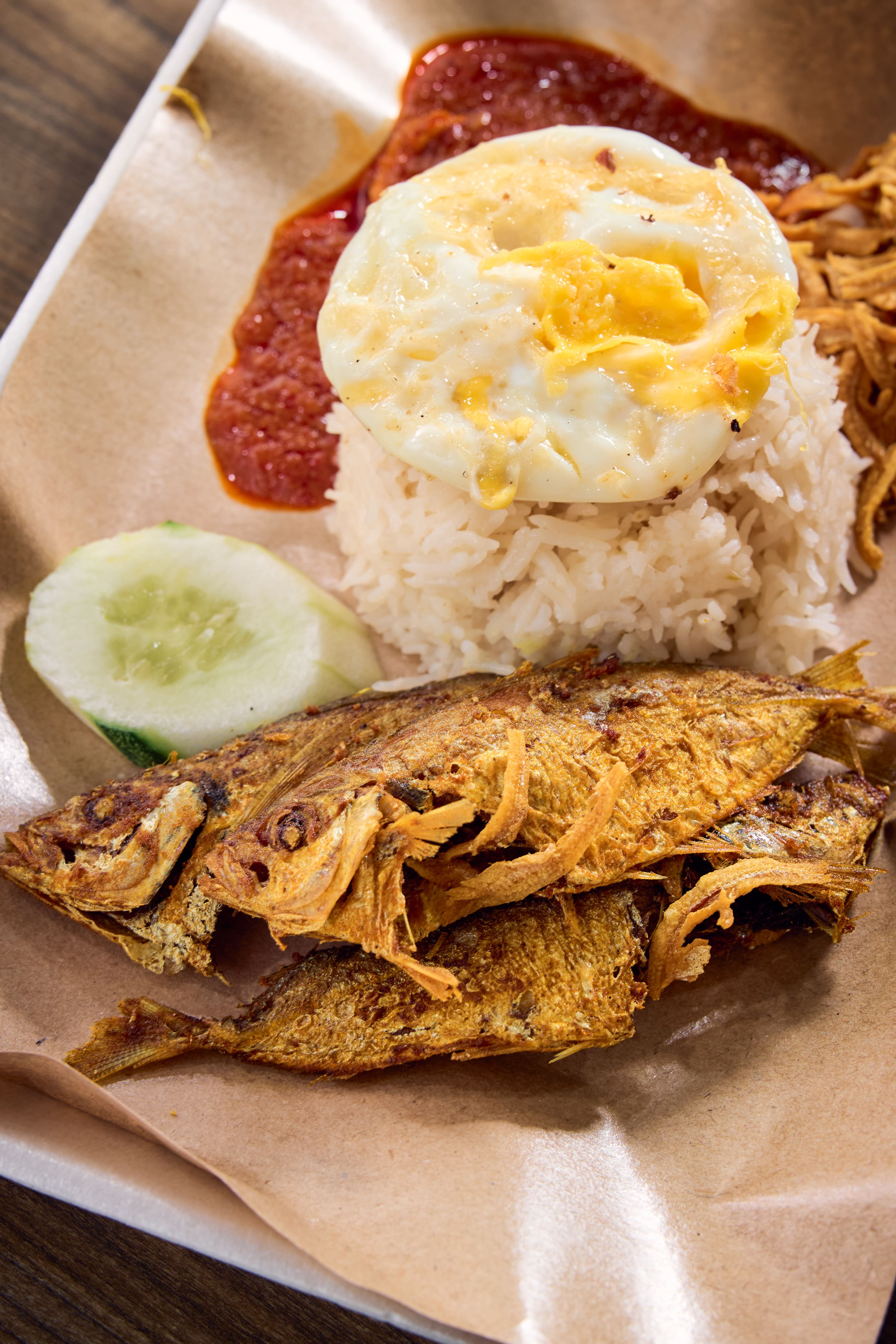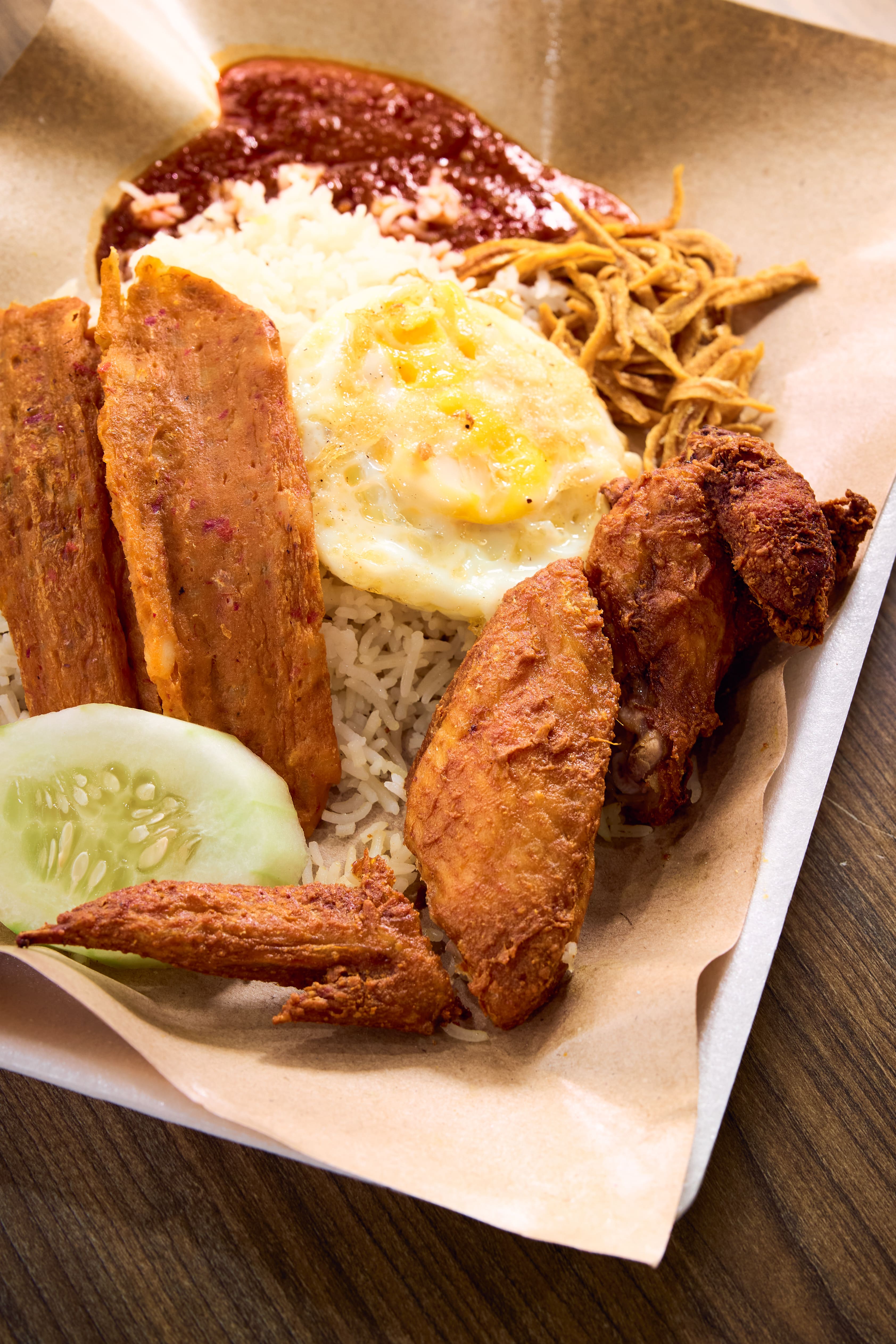 Masita plates her nasi lemak with the same neat precision you’d expect from an ex-SQ flight attendant. The tender basmati rice is fragrant and coconutty, with whiffs of pandan, while the chicken wing comes with a crisp skin that gives way to juicy meat. The supplier-sourced otak is serviceable – mildly spicy but otherwise unremarkable.