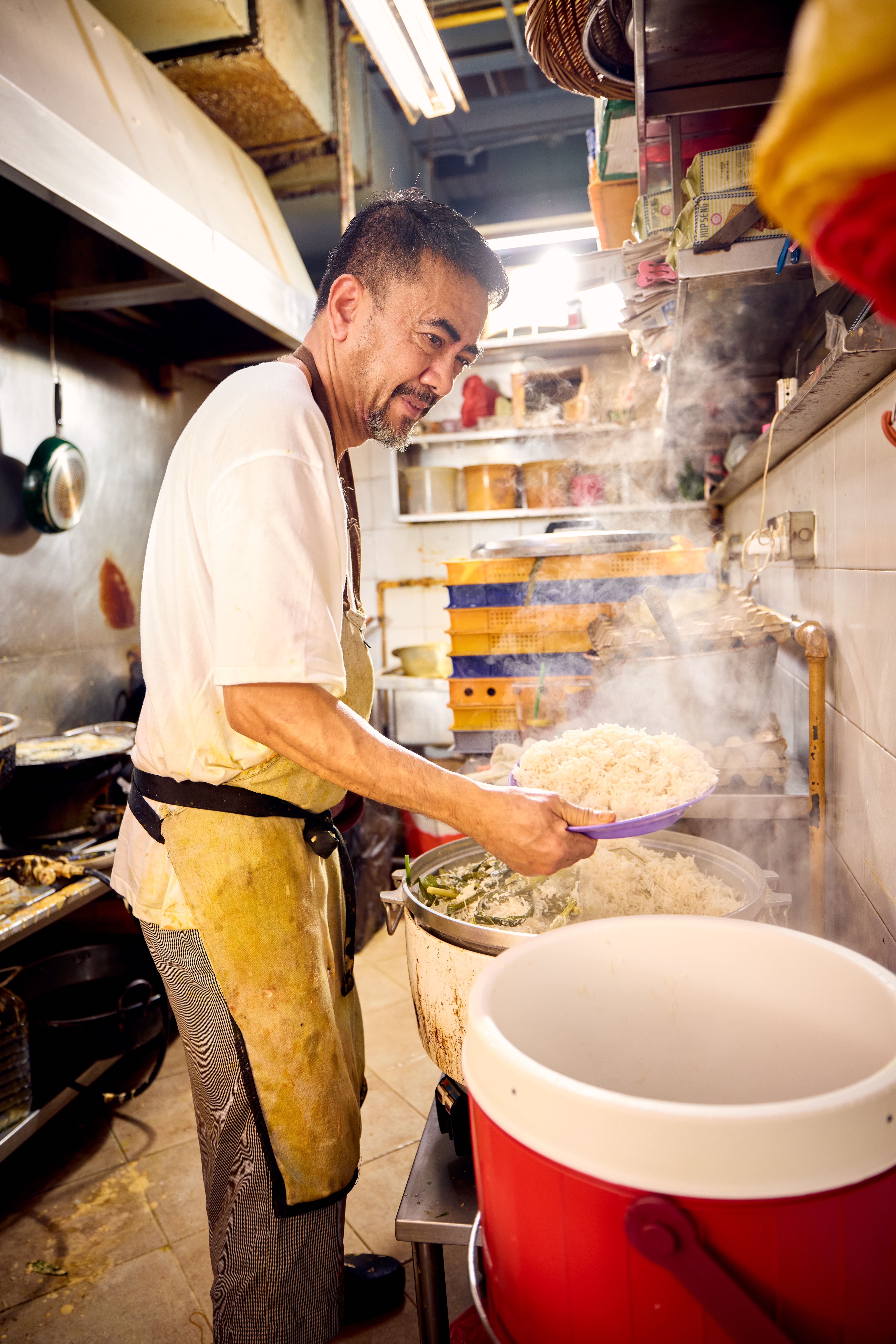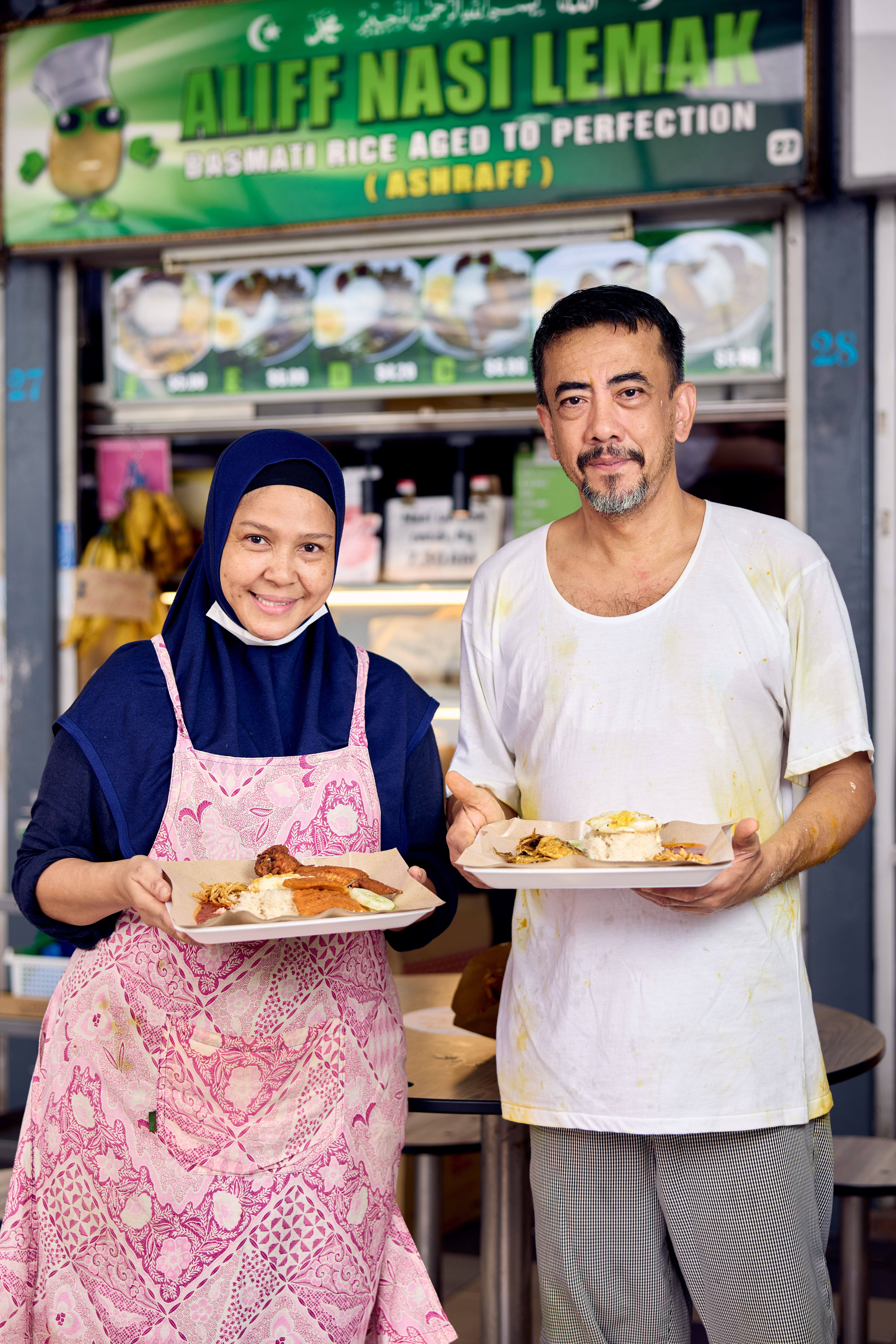 Her hubby Firuz’s path to nasi lemak hawker wasn’t straightforward either. After his ‘O’ levels, he took an IT course and landed a job as a computer analyst at Singapore General Hospital, overseeing critical systems in its data centre. When his grandfather passed away, Firuz stepped in to take over the family’s butcher stall at Geylang Serai Market. As cheaper frozen meat imports began affecting business, he closed the stall and, in 1995, opened Aliff Nasi Lemak’s original Bedok outlet. “I’ve always wanted to be in F&B. I love to cook,” he says.